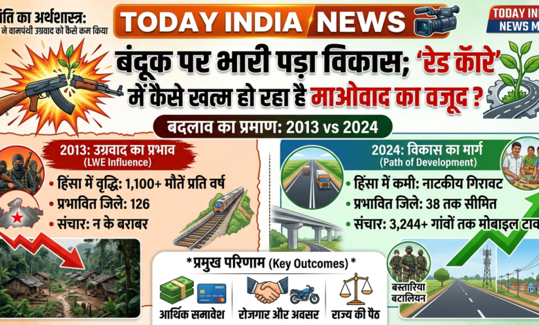 भारत के नक्शे पर कभी ‘लाल घेरे’ (Red Corridor) के रूप में पहचाने जाने वाले अशांत क्षेत्रों से अब हिंसा की चीखों के बजाय विकास की पदचाप सुनाई दे रही है। हालिया आंकड़ों और विशेषज्ञों की रिपोर्ट बताती है कि वामपंथी उग्रवाद (LWE) के खिलाफ भारत की सबसे बड़ी जीत केवल हथियारों से नहीं, बल्कि ‘शांति के अर्थशास्त्र’ से आई है।