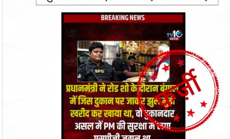 नई दिल्ली/झारग्राम: सोशल मीडिया पर प्रधानमंत्री नरेंद्र मोदी के पश्चिम बंगाल दौरे से जुड़ी एक तस्वीर और वीडियो तेजी से वायरल हो रहा है। इस पोस्ट में दावा किया जा रहा है कि प्रधानमंत्री झारग्राम में जिस स्थानीय विक्रेता की दुकान पर ‘झालमुरी’ (मुरमुरे का नाश्ता) खाने रुके थे, वह वास्तव में कोई दुकानदार नहीं बल्कि भेष बदलकर तैनात किया गया एक सुरक्षाकर्मी (SPG कमांडो) है।